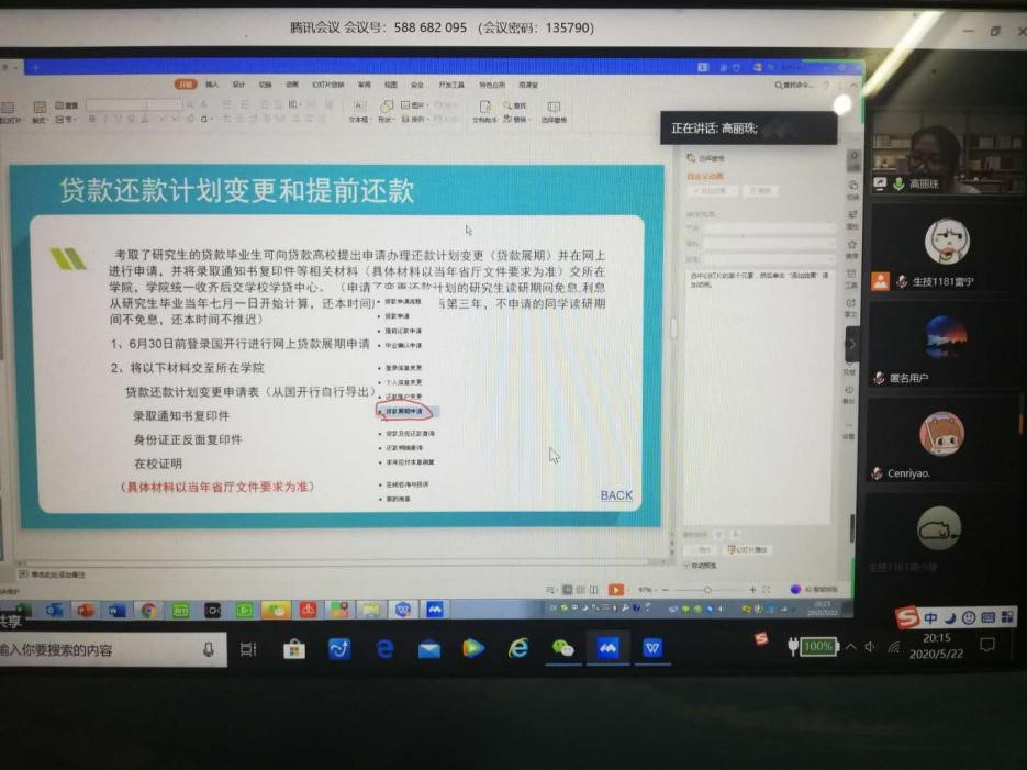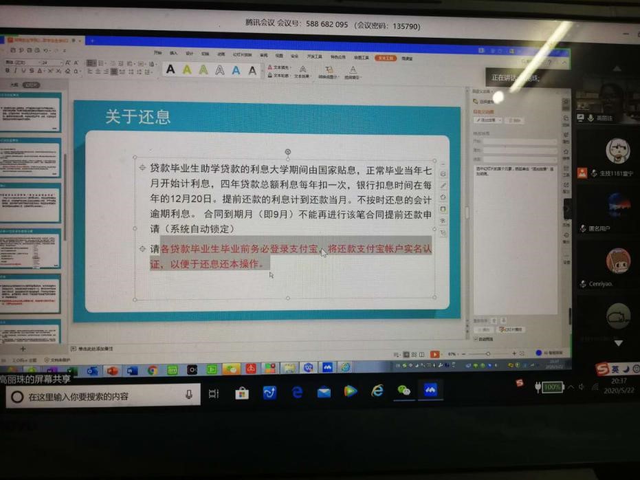为提高贷款毕业生的诚信感恩意识,帮助贷款毕业生了解掌握还款程序,2020年5月22日晚,太阳成集团tyc召开2020届毕业生还贷工作视频会议。会议由公司辅导员高丽珠老师主持,公司团委、员工会、勤工部干部及30余名贷款毕业生参加了会议。