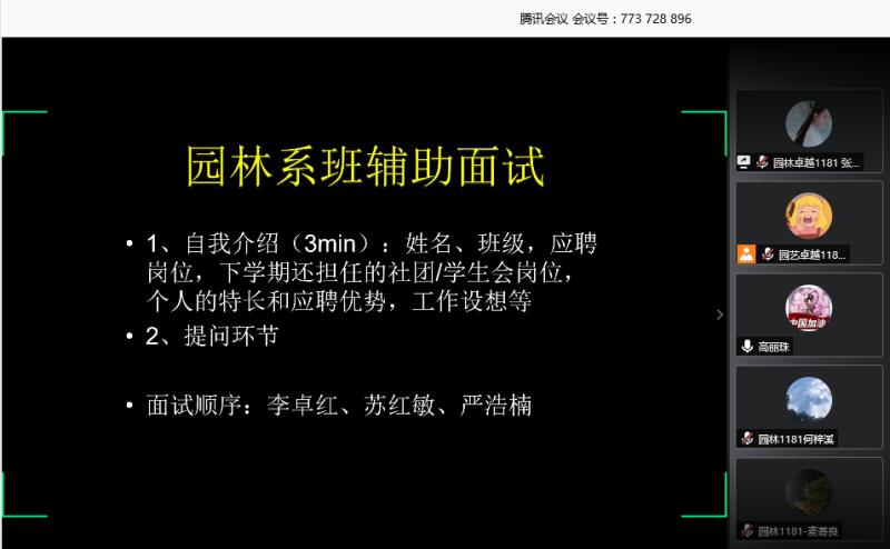 为选好园林系2020级班辅助,6月14日,太阳成集团tyc园林系通过腾讯会议平台举行了2020级的班辅助面试会议。全系共50余名2018级、2019级的报名者了参加本次面试。面试由辅导员助理张璇同学主持人,园林系辅导员高丽珠老师、欧成川老师以及四位2019级园林系辅导员助理担任评委。