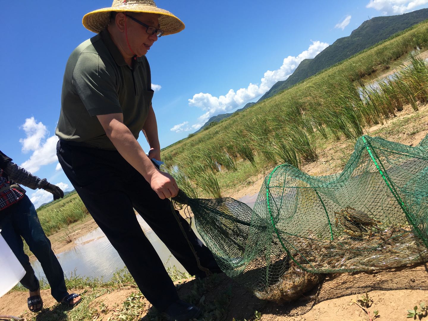 在公司陈日胜教授负责的渔稻共作海水稻示范种植基地现场,调研组领导和专家仔细查看了海水稻耐盐筛选场地和沿海堤坝与海水流灌情况。在一望无际的海水稻-虾、蟹种养结合试种养基地,当看到海水稻长势良好,虾、蟹丰收,大家兴致盎然,领导专家们一边认真听取陈日胜教授就海水稻种质资源、品种品系选育、示范种植和渔稻共作情况的汇报,一边进行详细探讨,并就海水稻试种与研究数据积累和整理提出意见和建议。