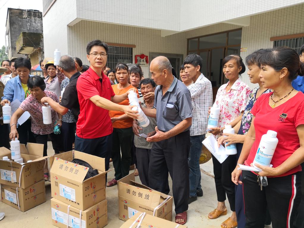 农村科技特派员在贫困村发放动物疫病治疗药物与消毒药