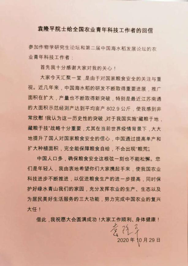 袁隆平院士给全国农业青年科技工作者的回信