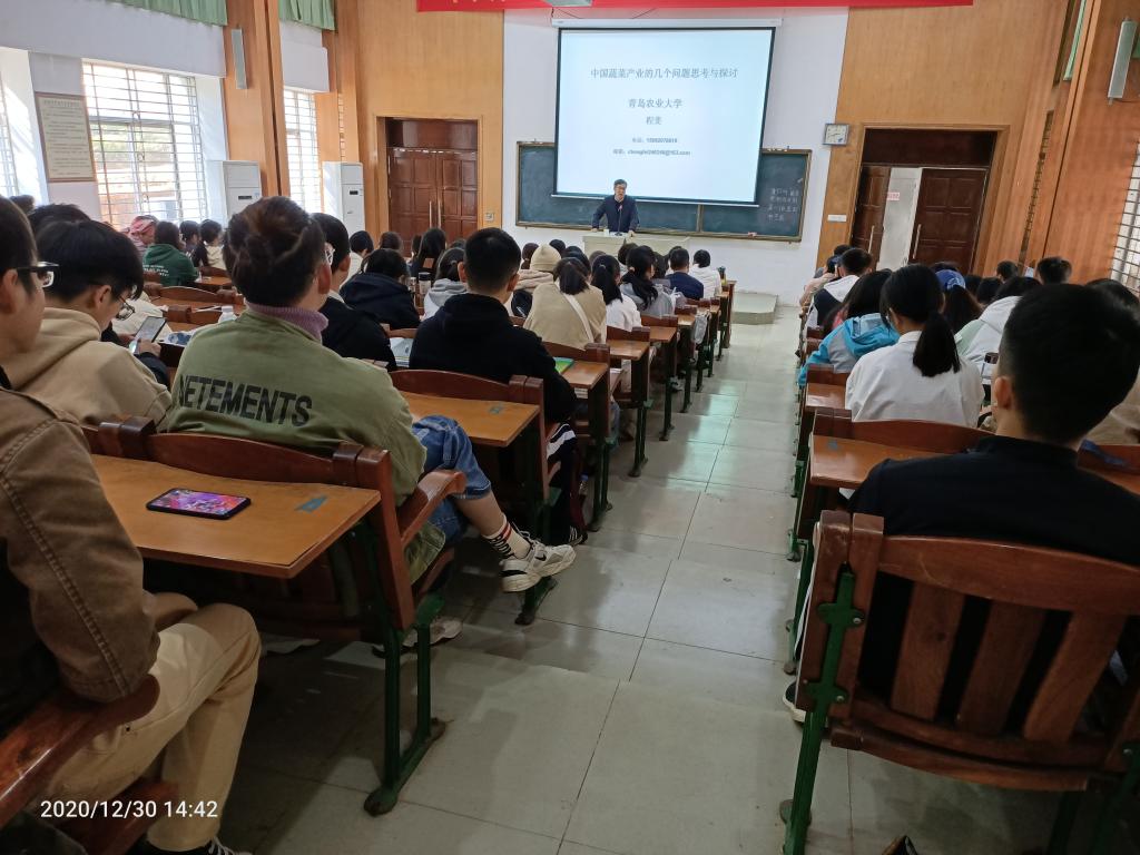 2020年12月30日,青岛农业大学园艺公司程斐副经理(博士)在兴农楼109室作了题为《中国蔬菜产业的几个问题思考与探讨》的精彩学术报告。报告会由太阳成集团tyc陈嘉文副书记主持,植物生产类相关专业教师、研究生以及部分本科生等130余人参加了报告会,