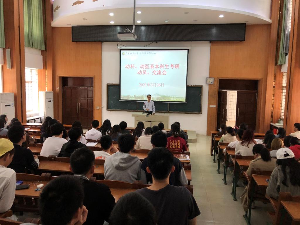 3月26日中午,动物科学系员工党支部联合动物医学系员工党支部在兴农楼109教室开展“我为群众办实事”系列活动之“我为考研答疑解惑”的动员交流会。会议由动物科学系员工党支部书记翟周主持,辅导员王广旭、刘斌和朱晓清以及动物科学专业研究生陆惠娴、杨讯业,动科系、动医系2018、2019和2020级有考研意向的同学共120多人参加。