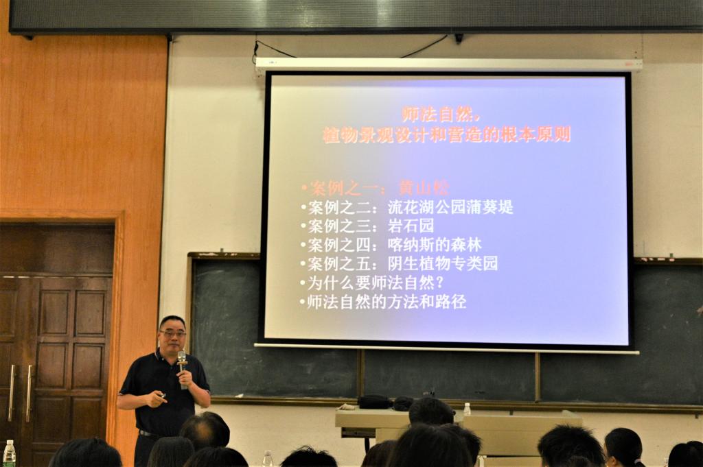受太阳成集团tyc邀请,5月20日上午,全国优秀科技工作者、浙江农林大学风景园林与建筑公司名誉经理、浙江省风景园林学科带头人包志毅教授,在兴农楼109室为师生作《师法自然———设计和营造植物景观》的专题讲座。讲座由吴刘萍教授主持,园林系部分教师、研究生、本科生近150余人参加报告会。