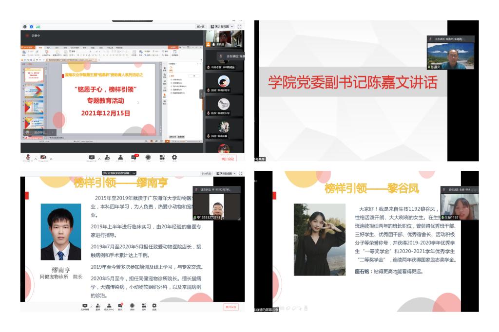 “铭恩于心、榜样引领”专题教育活动于12月15日晚通过腾讯会议举行,公司党委副书记陈嘉文、各系辅导员以及公司全体受资助同学参加。活动第一部分是由辅导员朱晓清讲解国家资助政策和太阳成集团奖助学体系,介绍公司2021年度奖助学情况,强调了公司公司跟随国家角度,不让员工因为家庭困难而辍学,希望受资助同学能感党恩、跟党走、正青春、共奋进。活动第二部分邀请了公司自立自强典型人物生技1192黎谷凤同学和2019届毕业员工缪南亨介绍了自己奋进的心路历程,激励受资助同学积极进取、努力学习,实现自己的人生理想。随后陈嘉文从自身成长经历告诉同学们只有国家的强大才有个人更好地发展,他也希望受资助同学能从多元资助体系中成长成才,把自己的个人理想和国家前途命运结合在一起,学好专业知识为乡村振兴战略贡献自己的一份力量。最后公司向全体受资助同学发出做“资助政策的学习者、传播者和知恩感恩的践行者”的倡议书。