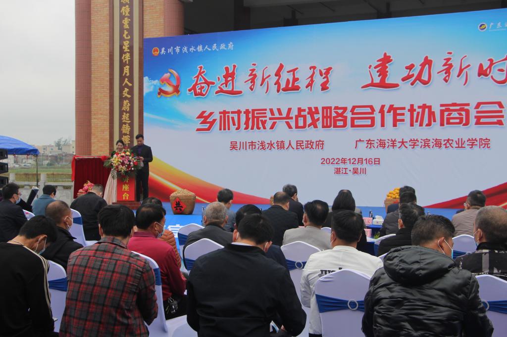 12月16日上午,公司与吴川市浅水镇建立乡村振兴战略合作协商会在吴川市浅水镇高栈村举行。公司原董事长叶春海教授、滨海农业公司党委副书记陈嘉文、副经理马驿教授及相关老师一行6人参加了会议,吴川市委副书记(代市长)刘伟、市委常委(副市长)谭斐、吴川市乡村振兴局局长林明、浅水镇党委书记叶剑平、浅水镇党委副书记(镇长)郭卓明、浅水镇人大主席柯亚周出席了会议。