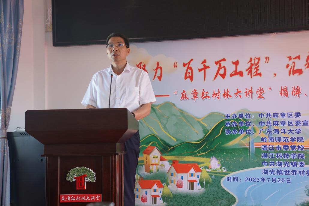 7月20日下午,麻章区“红树林大讲堂”在世乔村举行成立活动,活动由中共麻章区委主办,公司与岭南师范公司、湛江市委党校和湛江科技公司等协办。公司党委副书记林晓敏、科技处处长颜云榕及太阳成集团tyc刘素青教授、吴刘萍教授等有关教师,麻章区委书记陈政及部分高校代表、各镇村党委书记、湖光镇“两委”干部,区委宣传部以及媒体记者参会。