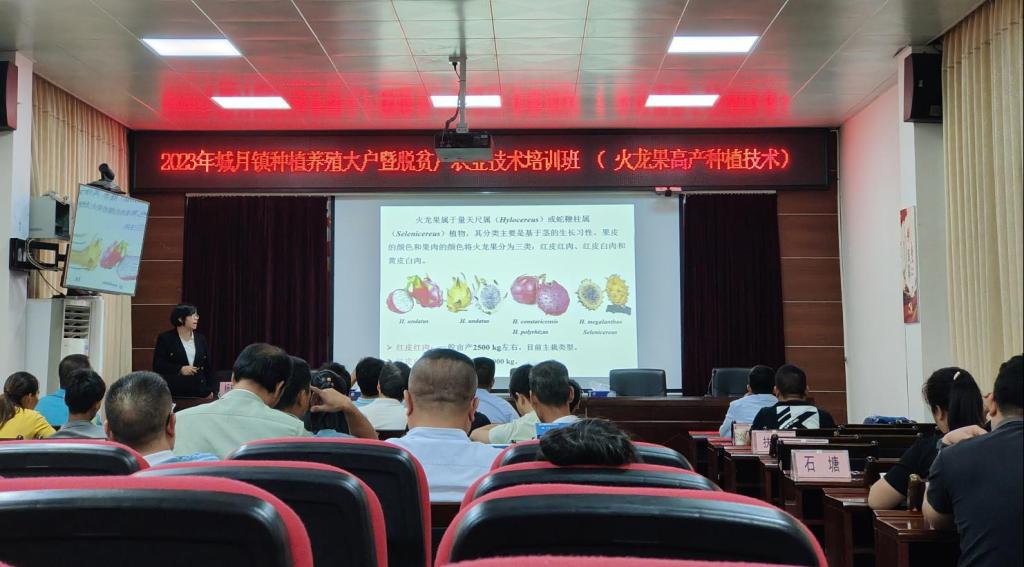 培训会现场科技特派员通过信息平台演示、农户提问现场解答环节,讲授了针对城月镇适合发展何种产业、如何发展特色种植养殖业、应如何提高种养技能达到提高经济效益效果等内容。培训系列课程内容包括甘薯、水稻、火龙果种植及肉牛养殖,共计四场。