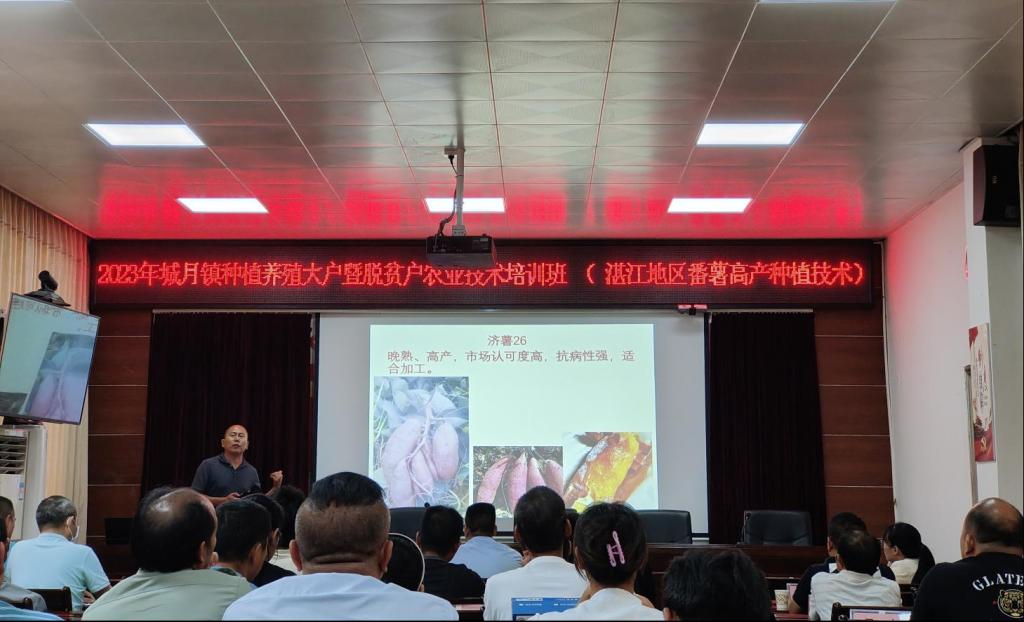 朱宏波副教授讲解“粤西甘薯高产高效栽培技术要点”。一是种植时间,甘薯种植生长期受低温和栽培制度制约,十月前后较为适宜;二是选地和整地,栽培环境要选择土层深厚、排水良好、富含有机质的沙质土壤,同时注重提高土壤肥力,保持土壤酸碱度适宜;三是品种的选择,要选用适应性强、抗病性好、产量高的优良品种,西瓜红较为适合城月种植;四是种养过程中病虫草害防治、滴灌施肥设施及施肥措施。本次课程切实帮助城月镇种植农户科学种植甘薯、规范施肥管理、提升红薯品质、提高红薯产量,促进增收致富。
