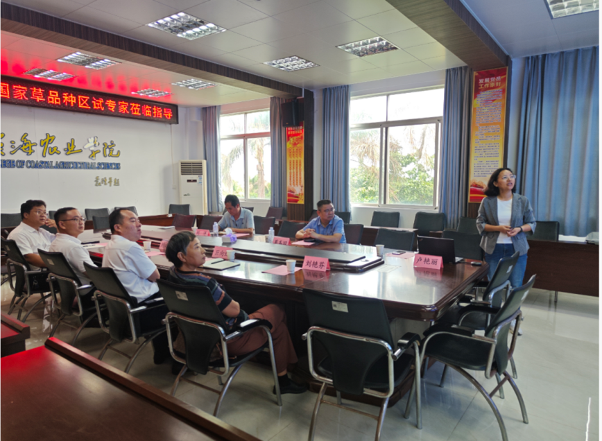 会上,刘文超副经理致欢迎词并简要介绍了公司基本情况。项目负责人卢艳丽博士专题汇报了湛江站自设立以来的建设进展及任务完成情况。站点创建人刘艳芬教授进行了补充说明。在查阅资料,听取汇报后,对照国家草品种区域试验站建设标准,专家组对湛江站的基础设施、基本条件、区试队伍和任务完成情况给予了充分肯定。建议要加强乡土草种的选育,特别是耐盐碱牧草种质创新,促进科技成果转化,推动草-畜一体化进程;加强与属地政府主管部门联系,通过公司积极向全国畜牧总站和国家牧草产业体系建言献策。