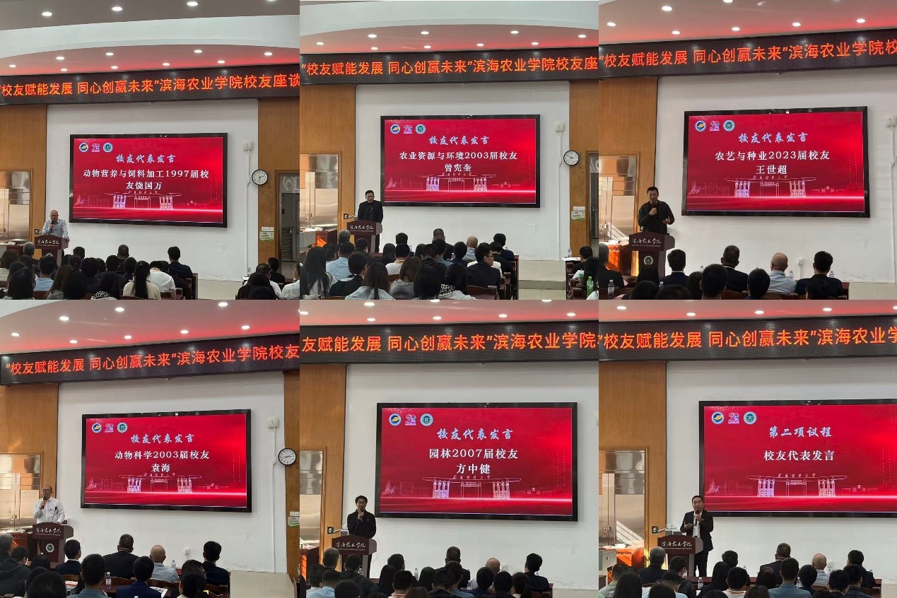 在交流分享环节,六位跨越不同年代的员工代表依次发言,结合各自成长轨迹与行业洞察,分享感悟、建言未来。从1997届饶国万员工强调的“专业深耕与资源整合”,到2003届袁海员工看重的“沟通素养与前沿视野”;从同届曾宪奎员工“惜时追梦、锤炼素养”的真诚勉励,到2007届方中健员工提出的“守正创新、跨界融合”发展理念;再到王世超员工以水稻育种实践诠释学科精神的接续传承,以及1991届王华强员工通报捐赠进展所体现的深厚情谊——不同年代的奋斗故事,共同凝结为“感恩母校、回馈行业、矢志奋斗”的精神主线,展现了滨海农院员工群体历久弥新的凝聚力与担当。