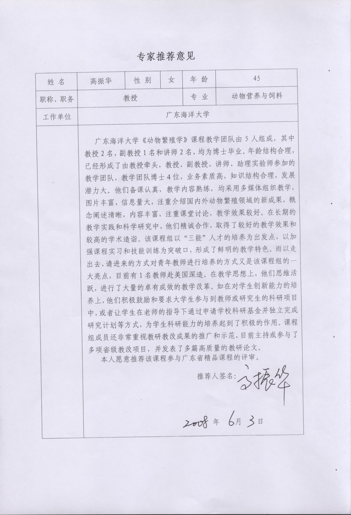 高振华教授推荐意见