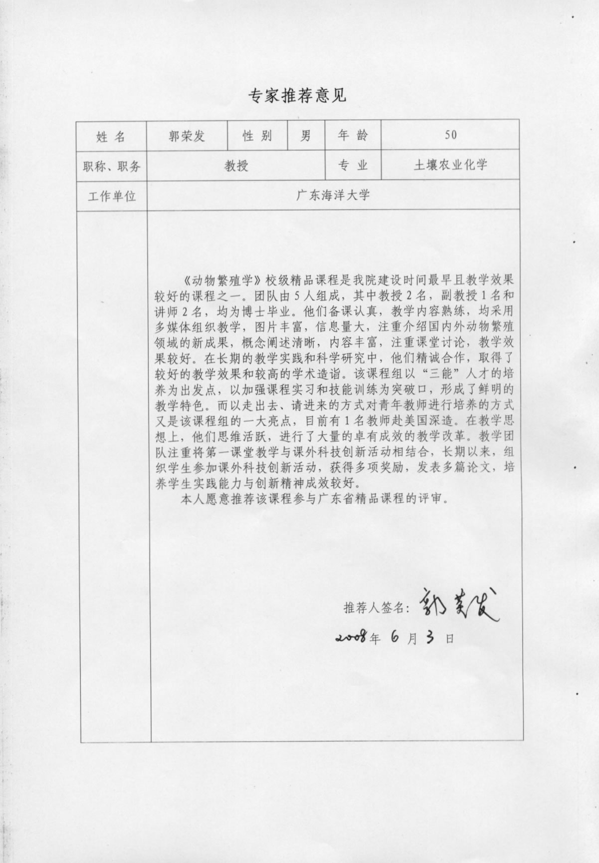 郭荣发教授推荐意见