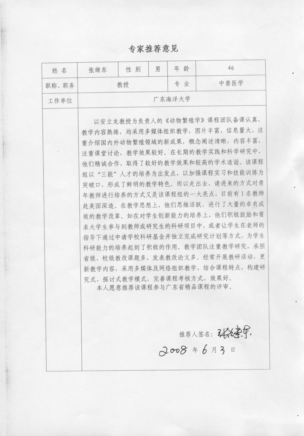 张继东教授推荐意见